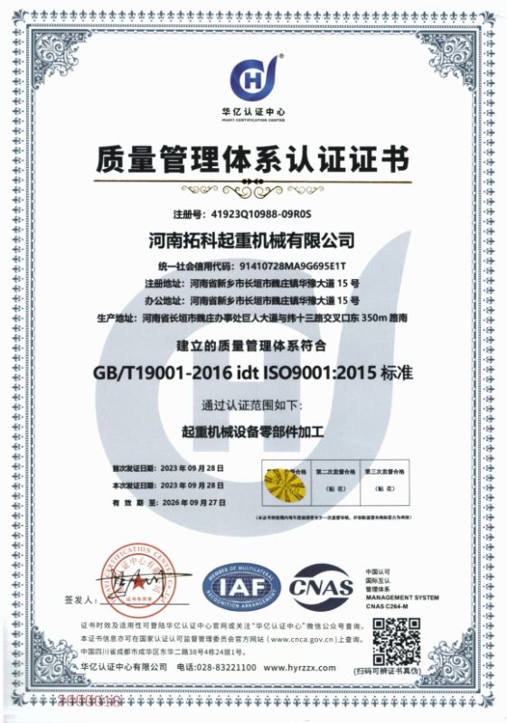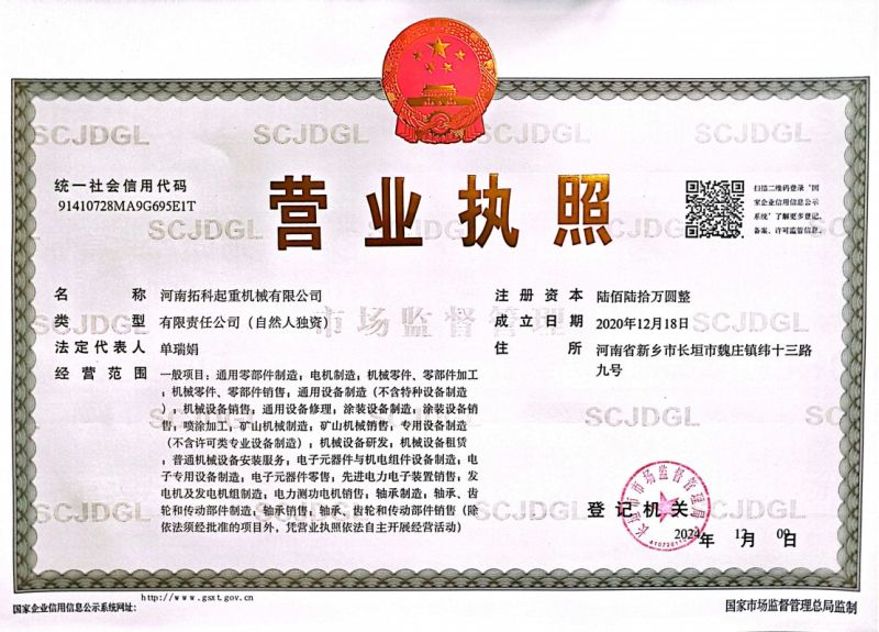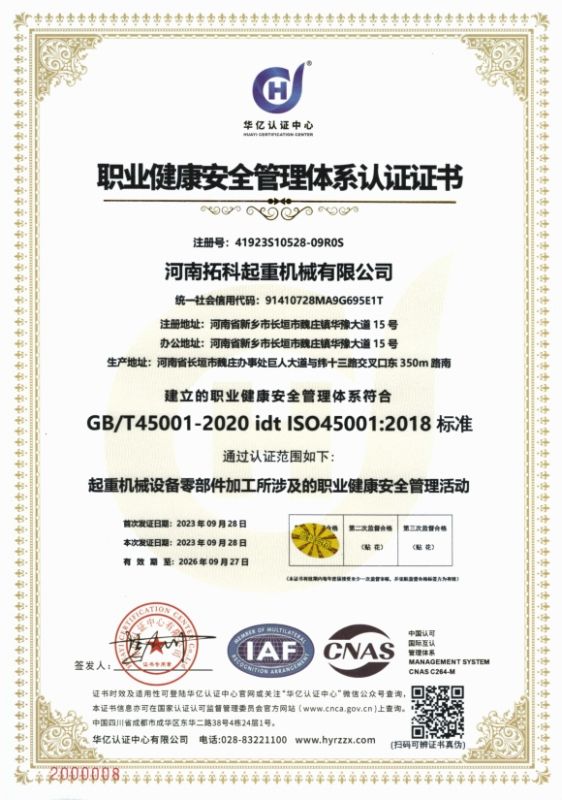 河南拓科起重机械有限公司成立于2020年,占地面积29000m2,位于中国起重机械名城、全国综合实力百强县市之一的河南省长垣市,是一家集起重机械设计、研发、生产、销售、服务于一体的现代化企业。现有员工50余人,其中大专以上学历20人,技术人员5人。公司先后通过了ISO 9001、45001、14001体系认证。